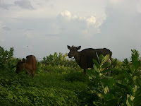 Aamuvirkut paikalliset tervehtivät meitä ja ohitimme myös meitä möllöttäneitä lehmiä. Kukot kiekuivat talojen pihoissa ohikulkiessamme. Saaren takaosissa ranta on vielä suureksi osaksi rakentamatonta, joten polku kulki vehreän kasvillisuuden lävitse. Loppumatkasta aurinko alkoi olla jo sen verran korkealla, että kiristimme tahtia, jotta pääsisimme mahdollisimman pian hotellille aamiaiselle ja varjoon. Hiki kierroksella tuli, vaikka emme paljon tuntia kauempaa saaren ympäri kävelleetkään. Pieni paikka tämä siis on.